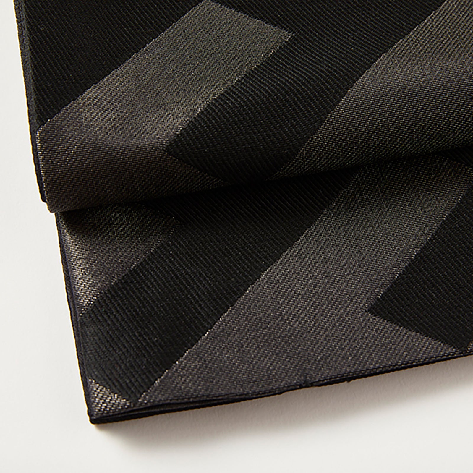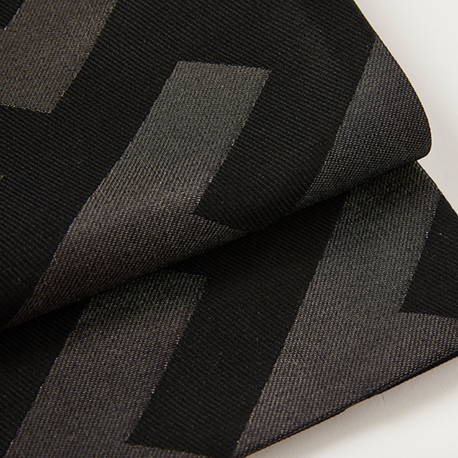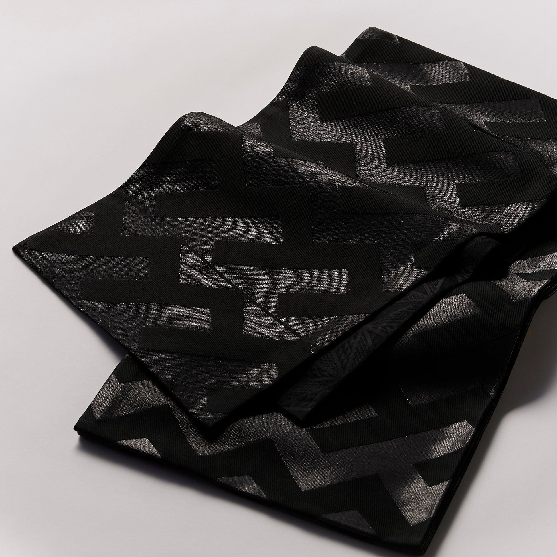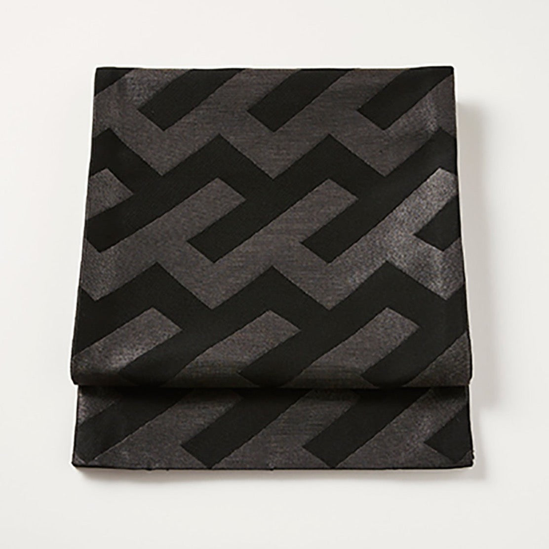 燻銀の地に古典模様の大きな黒紗綾形がインパクト大のモノトーン帯です。