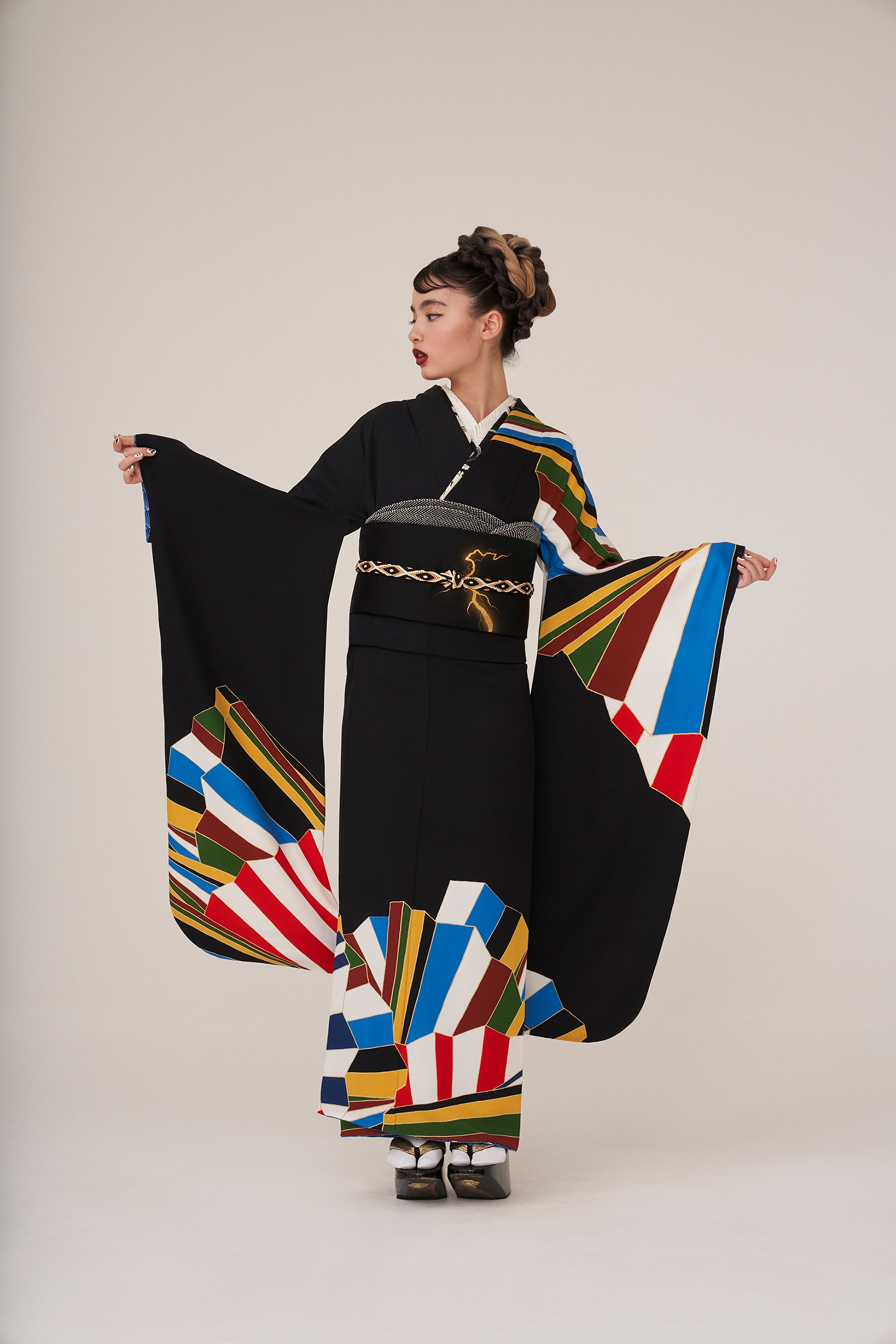 金彩帯は「摺箔」と「金泥描き」の二つの技法によって黄金に光る稲妻が描き出されています。太い稲妻は「摺箔技法」型紙で糊を引き金箔を貼り付けて表現されており、細く分かれる稲光りは「金泥描き技法」細かい純金粉を使い筆で直に描かれています。