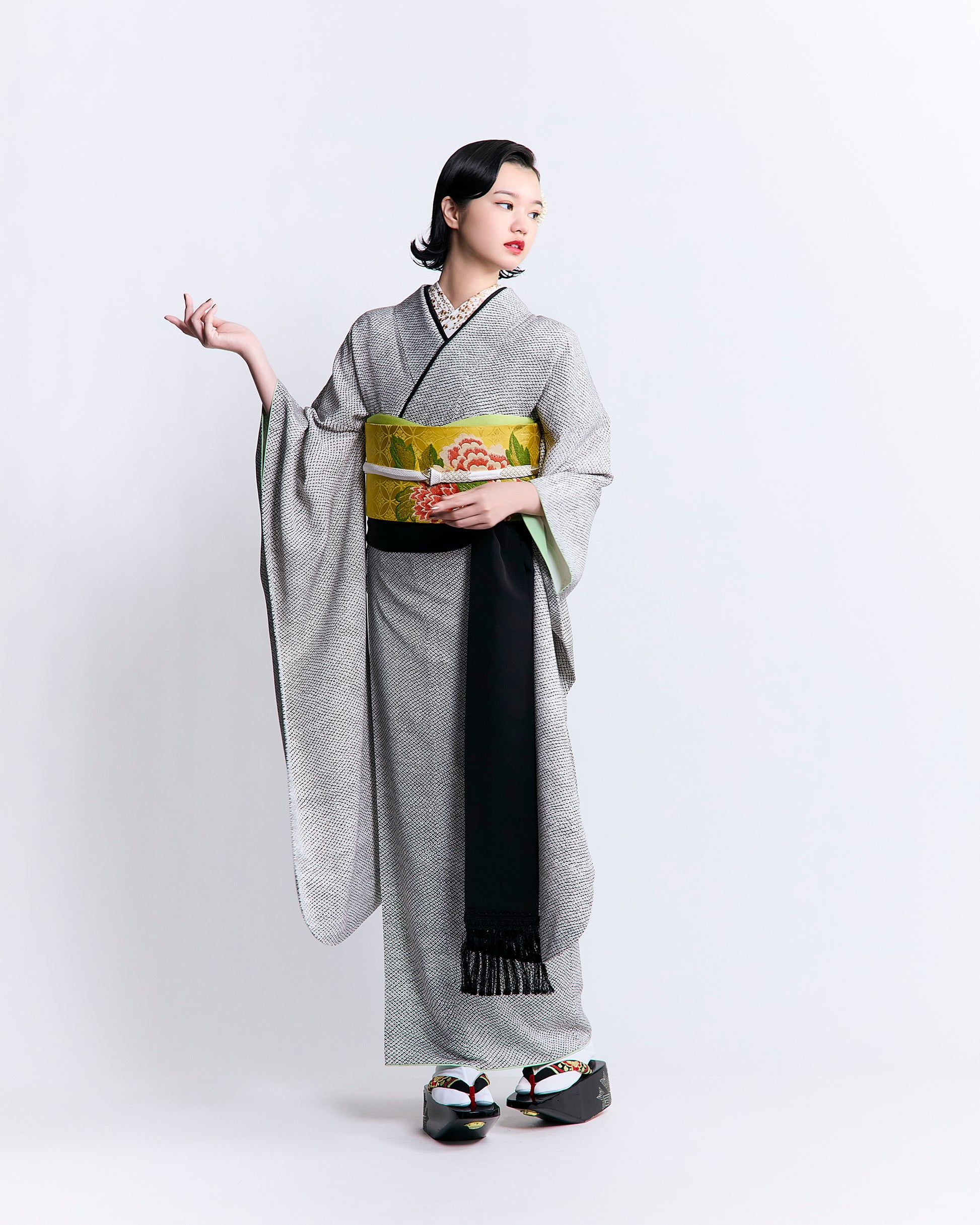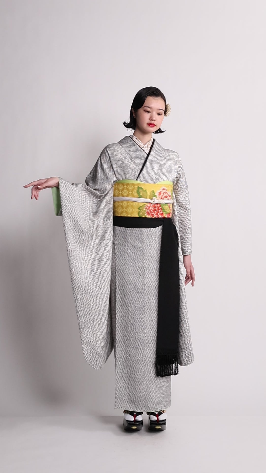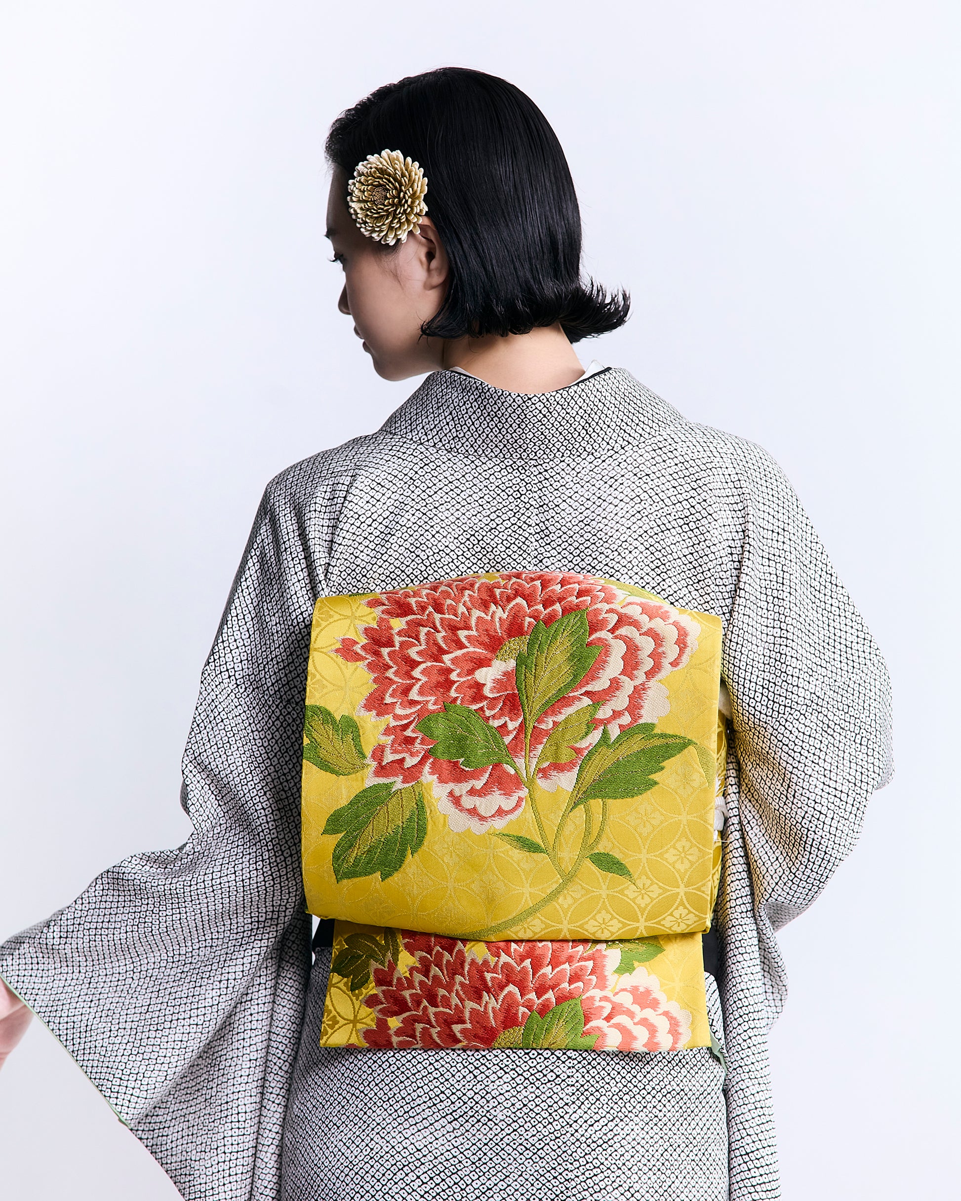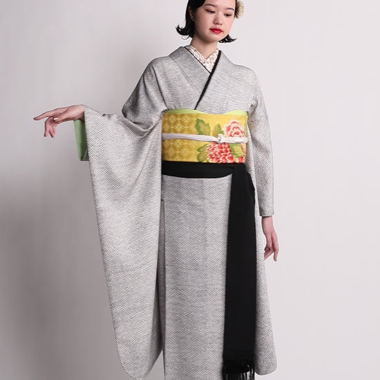 アンティークの鮮やかな帯を合わせることで、装いに大胆なアクセントを添えたコーディネートに。