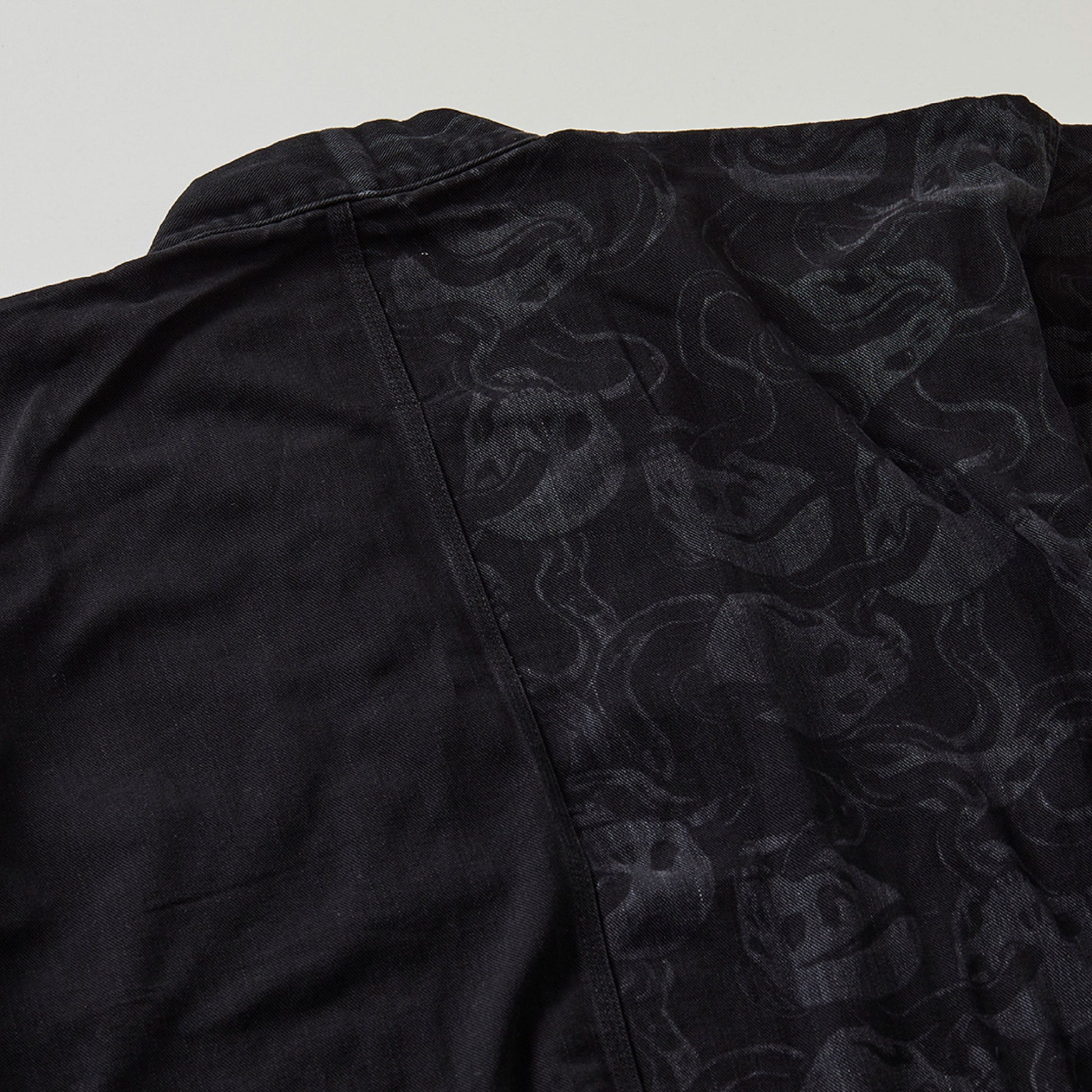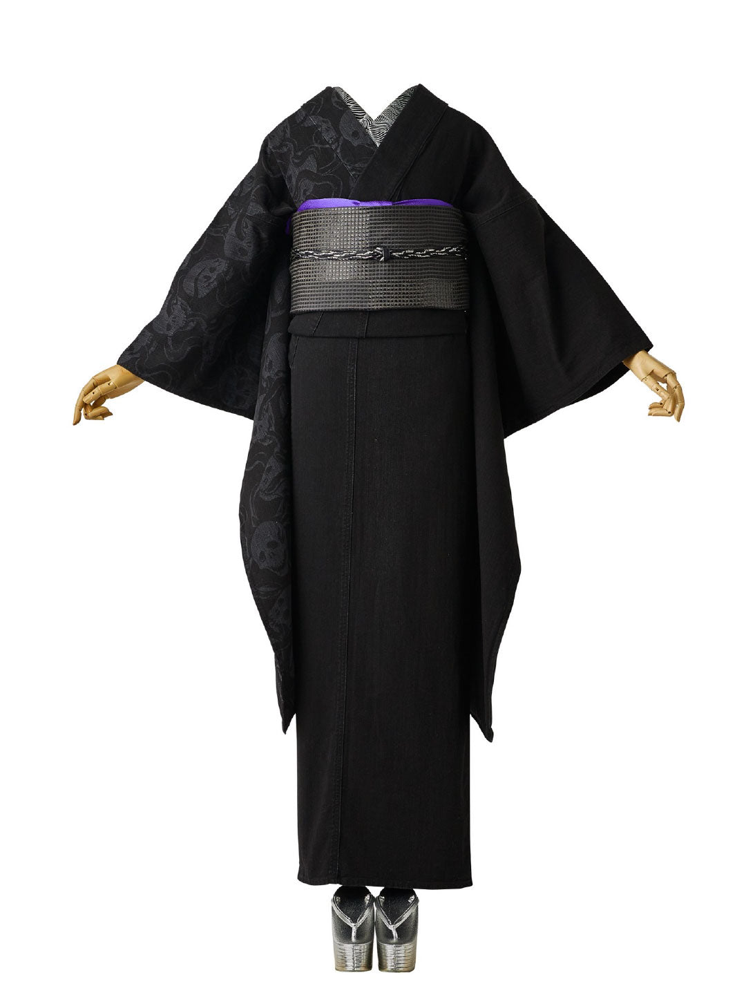 ブラックデニムに片身変わりの文様をほどこした「蛇と髑髏」のデニム振袖。レーザー加工技術を駆使し、まるで染めのように繊細な髑髏模様をデニムに表現。片身変わりの仕立て故、後ろ姿が一際目を引きます。お揃い柄の袋帯もございます。