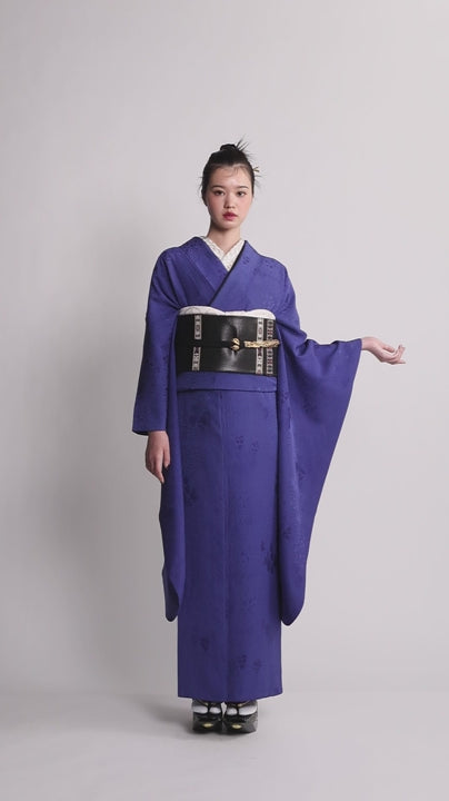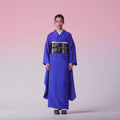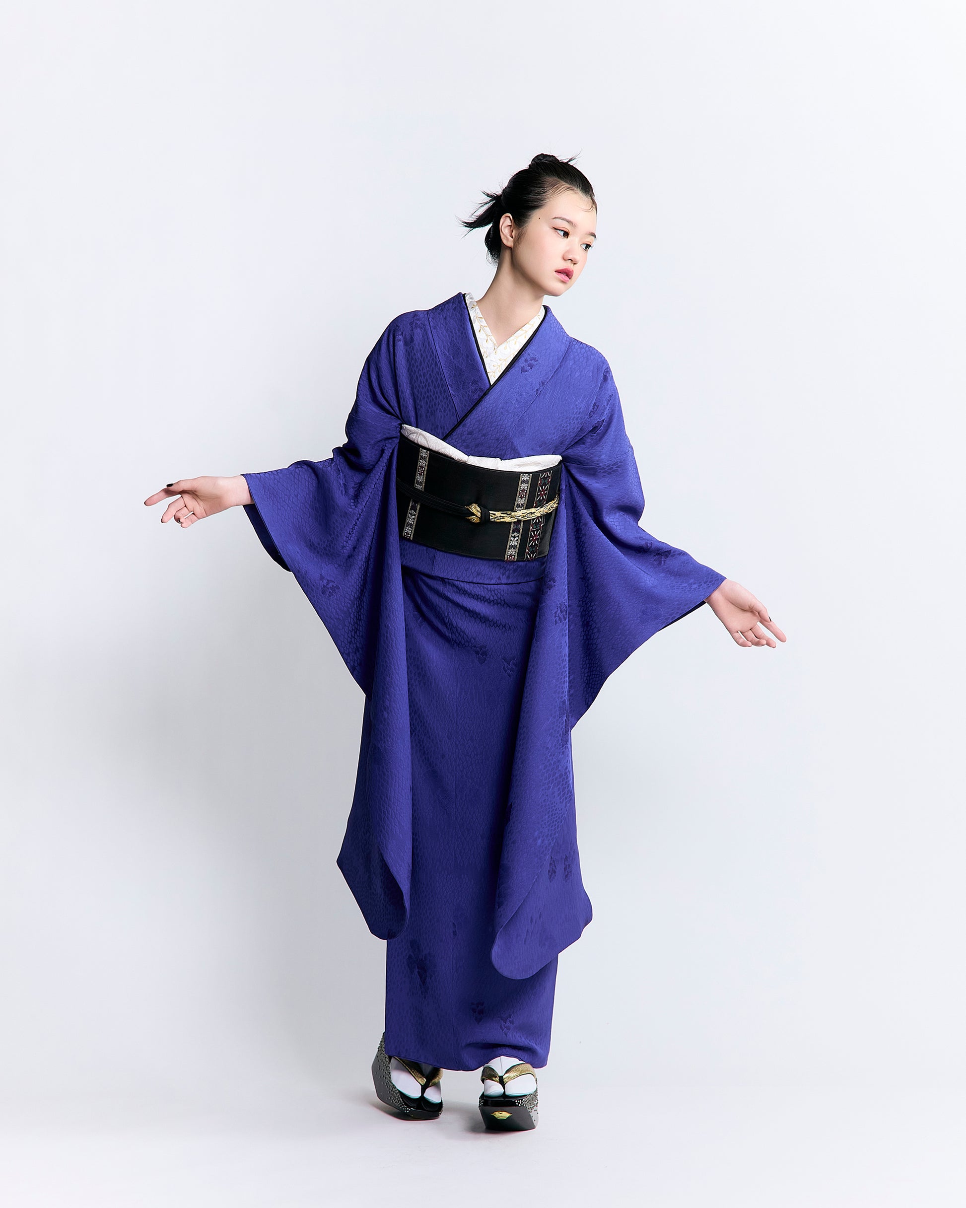 重なり合う鱗のような紋様が個性的な「幸縫取鱗」の振袖。部分ごとに織りの異なる生地は光に当たると柄が浮かび上がり、一色ながら豊かな表情をもつ色無地振袖です。大胆に藤の花があしらわれた帯と、お揃いの刺繍一つ紋。後ろ姿も大変魅力的な組み合わせです。